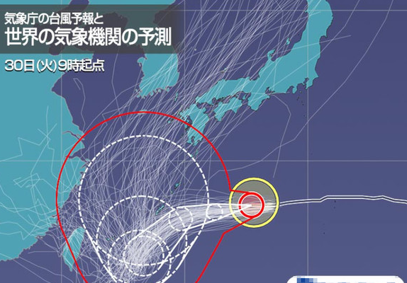 일본 기상청 예보를 보면 실시간으로 변화하는 태풍의 경로와 예상 경로를 볼 수 있습니다.